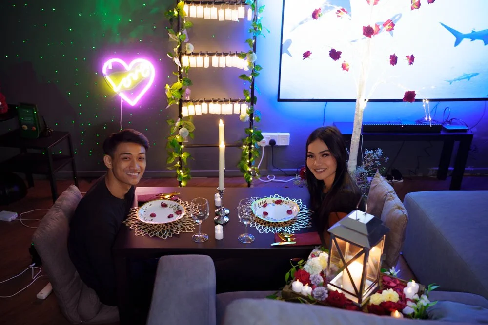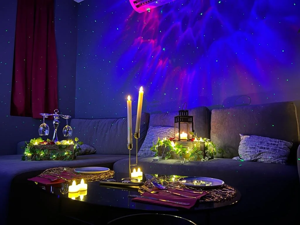 Write a short message on our lighted ladder board for him/her. Enjoy a REAL candle light ambience with a dinner table & wine glasses.